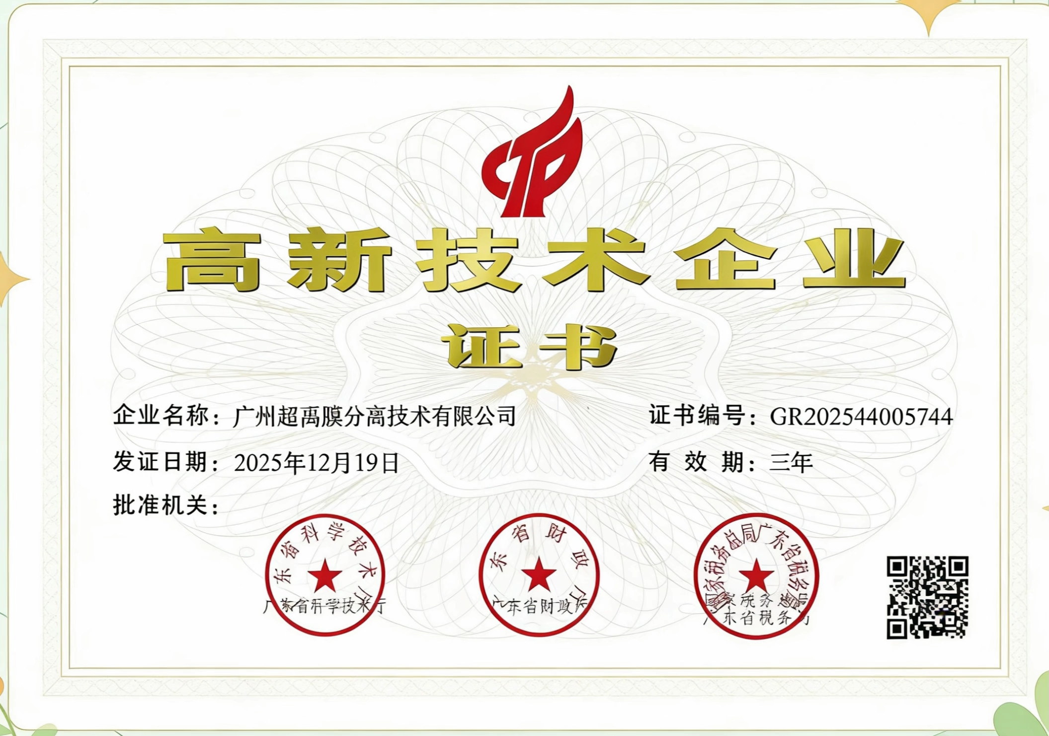 根据国家《高新技术企业认定管理办法》和《高新技术企业认定管理工作指引》的相关规定,广州超禹膜被再次认定为国家级高新技术企业。近日,公司也已收到了由广州市科学技术厅、广州市财政厅、广州省国家税务局、广州省地方税务局联合颁发的“国家高新技术企业”认定证书,由此再次迈入国家高新技术企业行列。